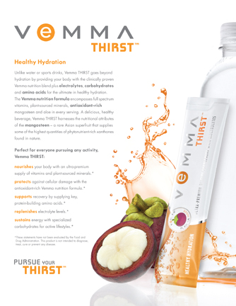 現在您不再需要喝下其他運動飲料裡那些不適當成分,例如超量的甜味劑和人工色素。這種好喝又健康的飲品,Vemma THIRST維瑪渴望™,含有山竹果 — 一種罕見的亞洲超級水果,可提供自然界最高量的植物營養素「山竹酮」。當您在跑馬拉松或推嬰兒車時,請使用Vemma THIRST維瑪渴望™來補充身體的能量。只要攜帶方便的隨身包,您就可以隨時隨地保持身體健康的水感。