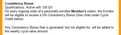 一致性獎金項目:簡單的說就是直推消費購買了什麽,我們就得到一次抽成,最少的,一盒維瑪果汁3美元,最多的,金級創業包50美元,直推消費一次領一次,這個容易理解。