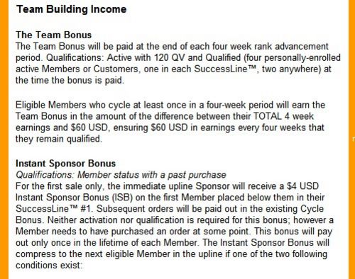 團隊獎金:領取資格的4名直推,VB翻譯有問題,根本是錯的,參加說明會后才知道就4周的周薪合計沒滿60美元的補到60,呵呵,基本無意義的一個獎金。過了兩個循環就領不到了,而且也不多。